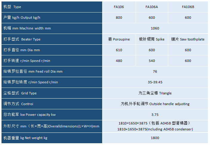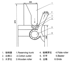 本產(chǎn)品在開清棉組中對經(jīng)初步開松的原棉或化纖做進一步的開松或除雜,由于加工原料 不同,本機的結(jié)構(gòu)與性能也略異,F(xiàn)A106與FA106A多用于化纖,F(xiàn)A106B的多用于加工各種等級的原棉。